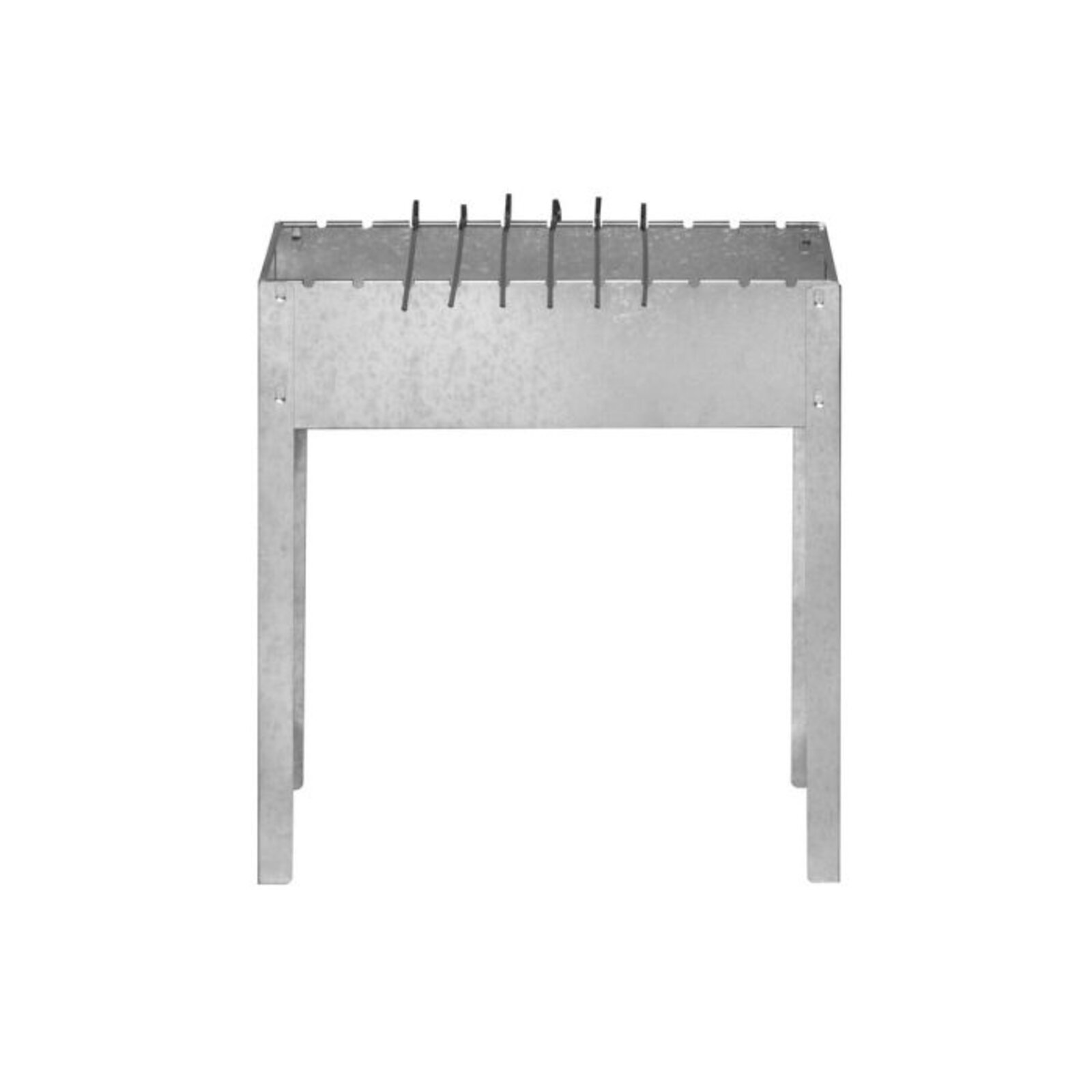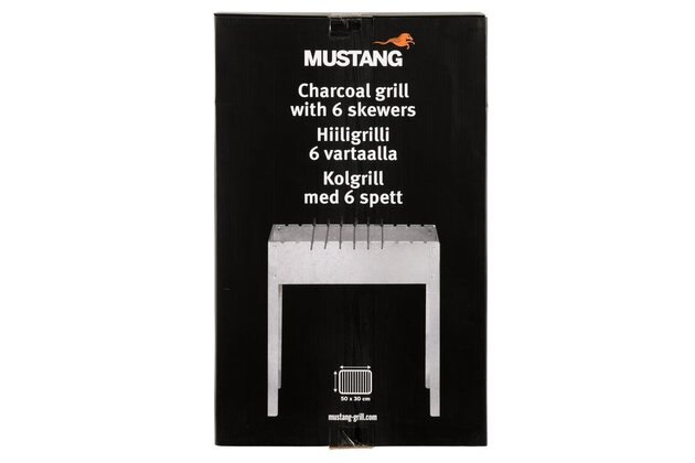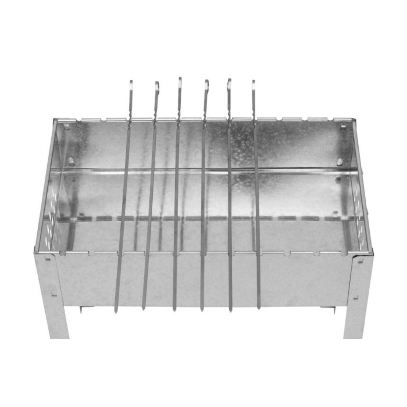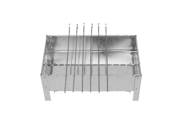 Nerezový gril na dřevěné uhlí se šesti nerezovými špízy.