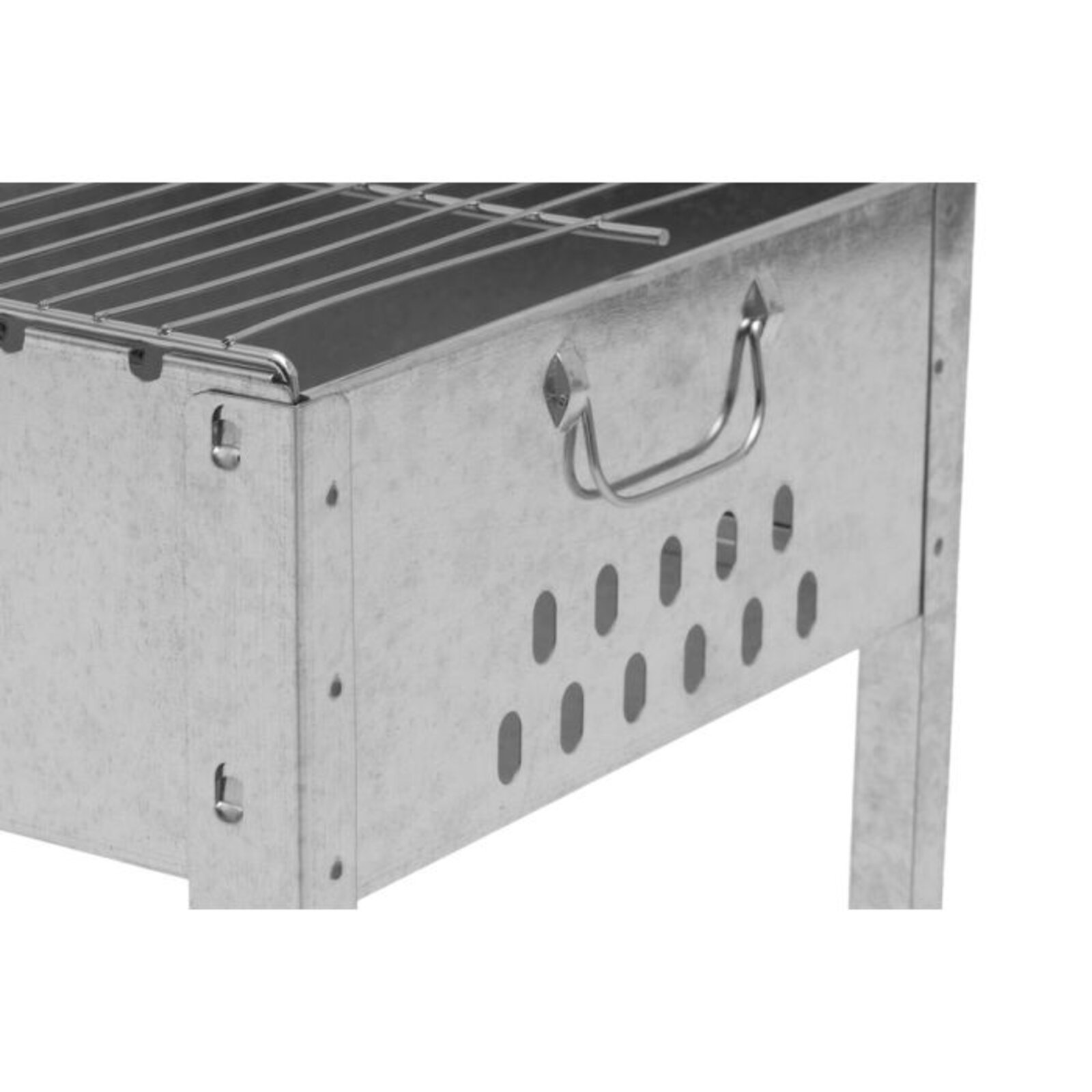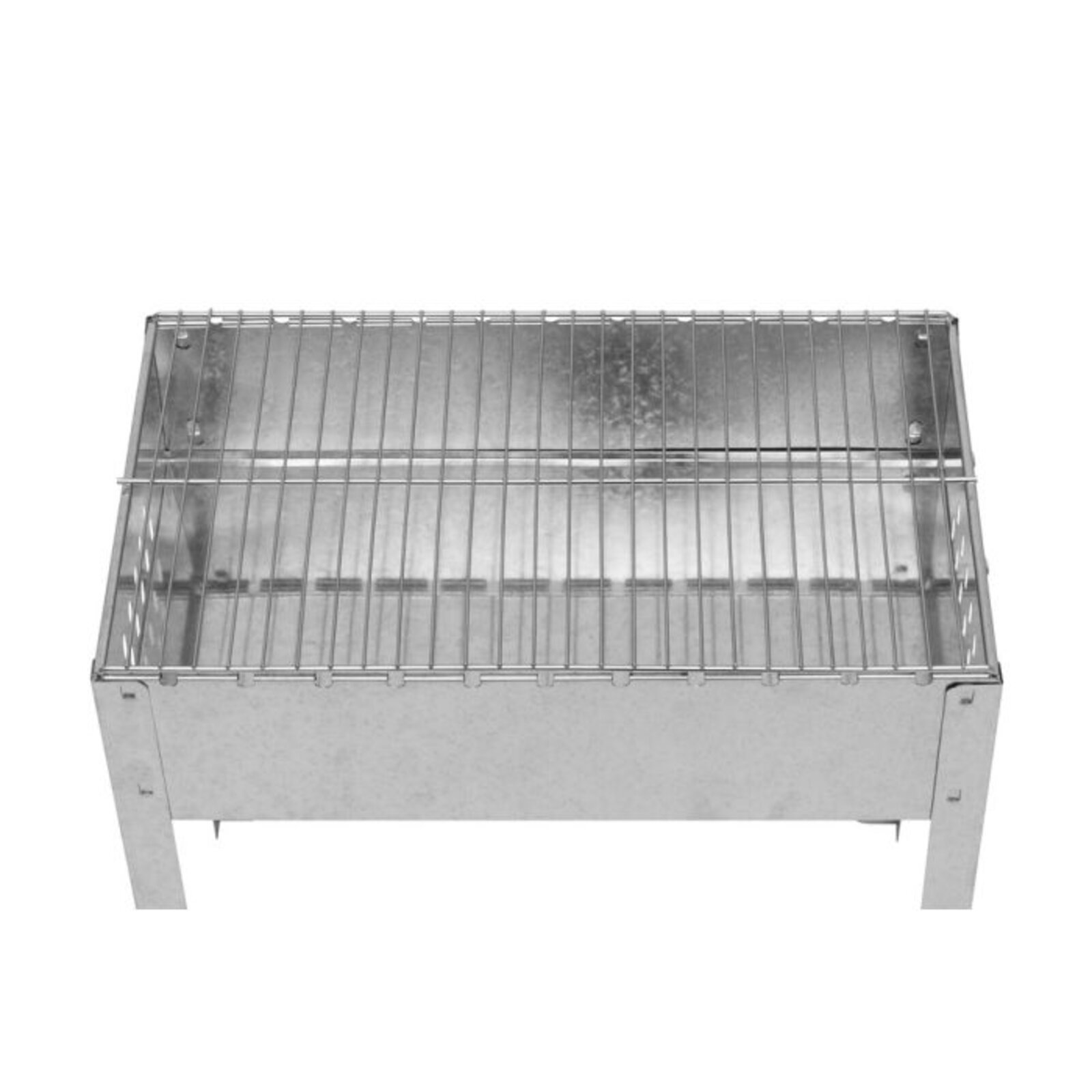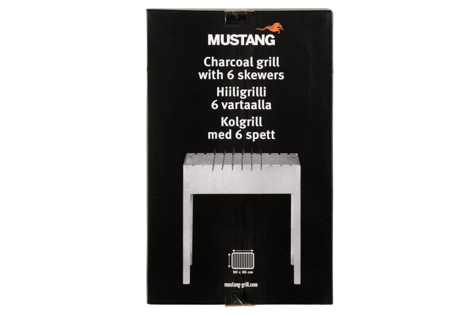 Nerezový gril na dřevěné uhlí se šesti nerezovými špízy.