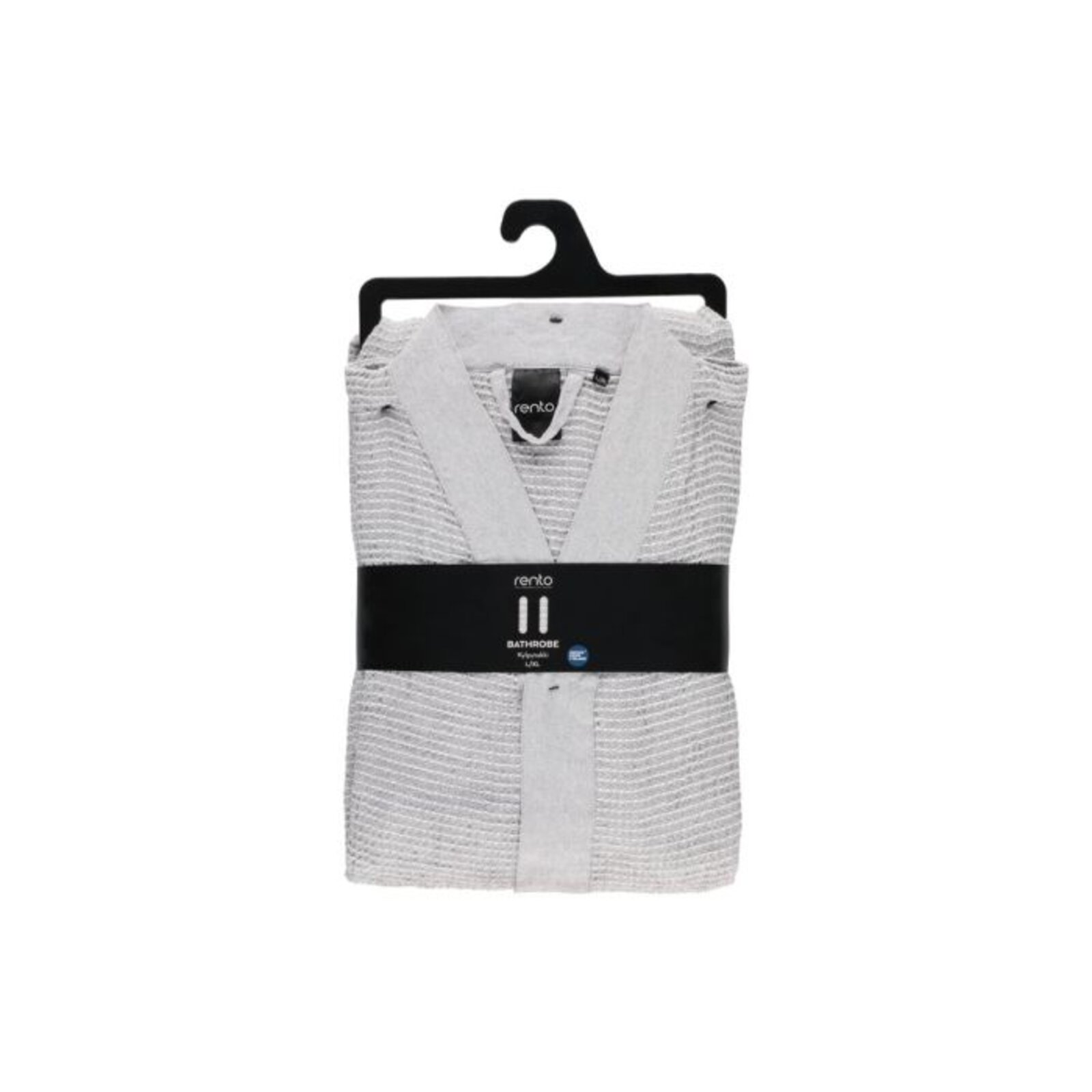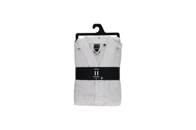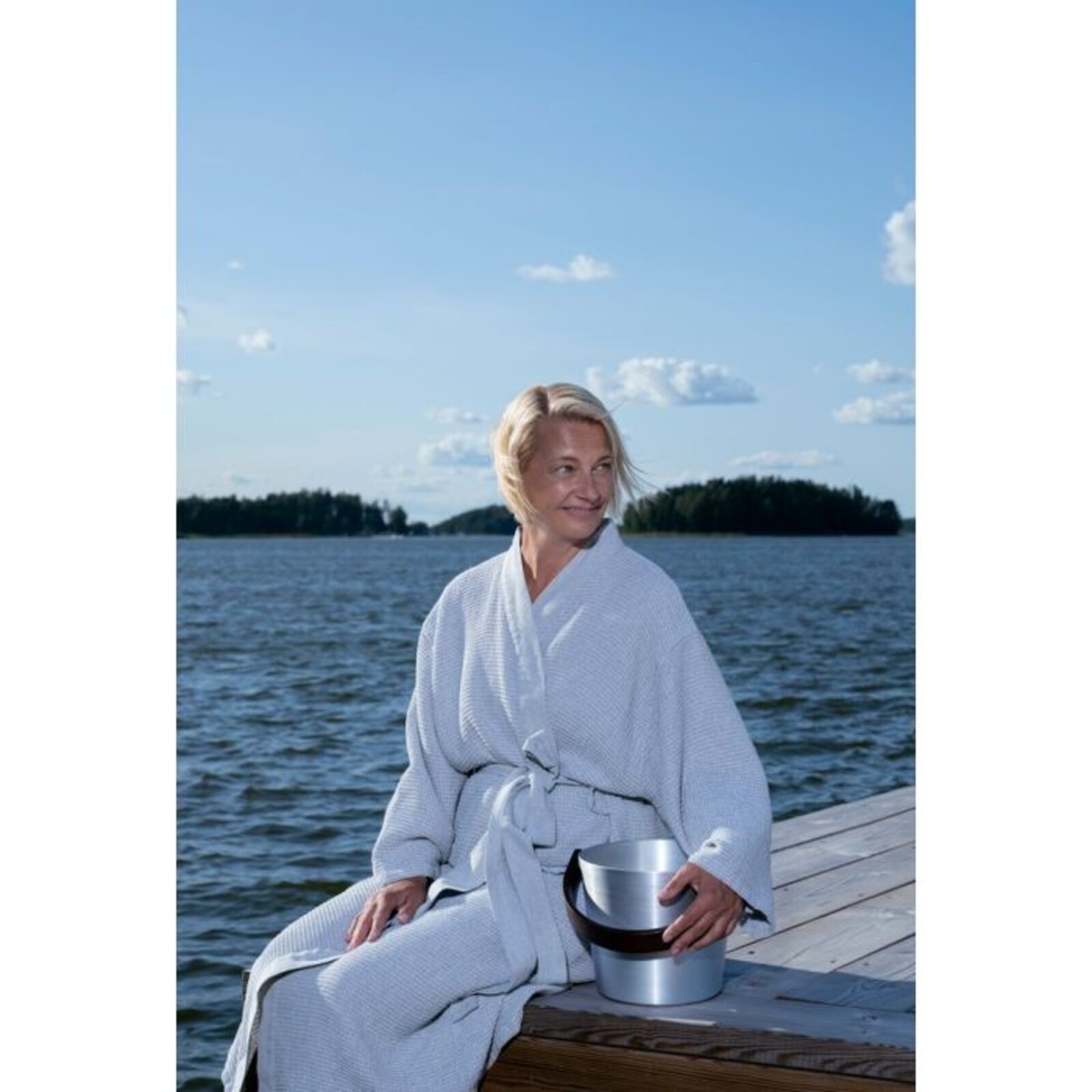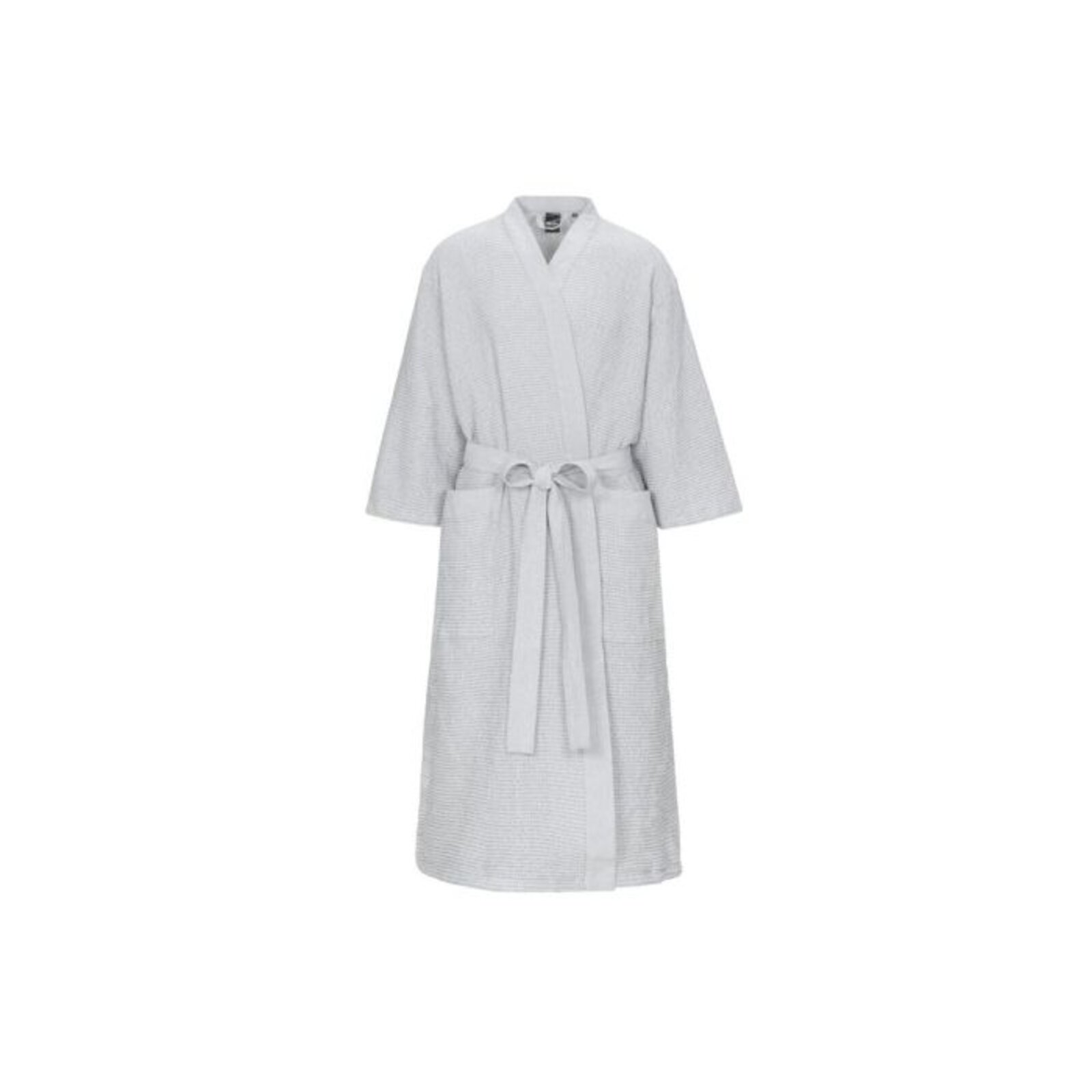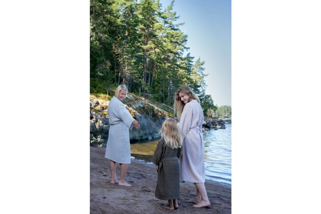 Saunový župan s chambray ramínky a páskem. Recyklovaná bavlněná textilie pro saunu se vyznačuje jemností a vokšinovou strukturou látky.