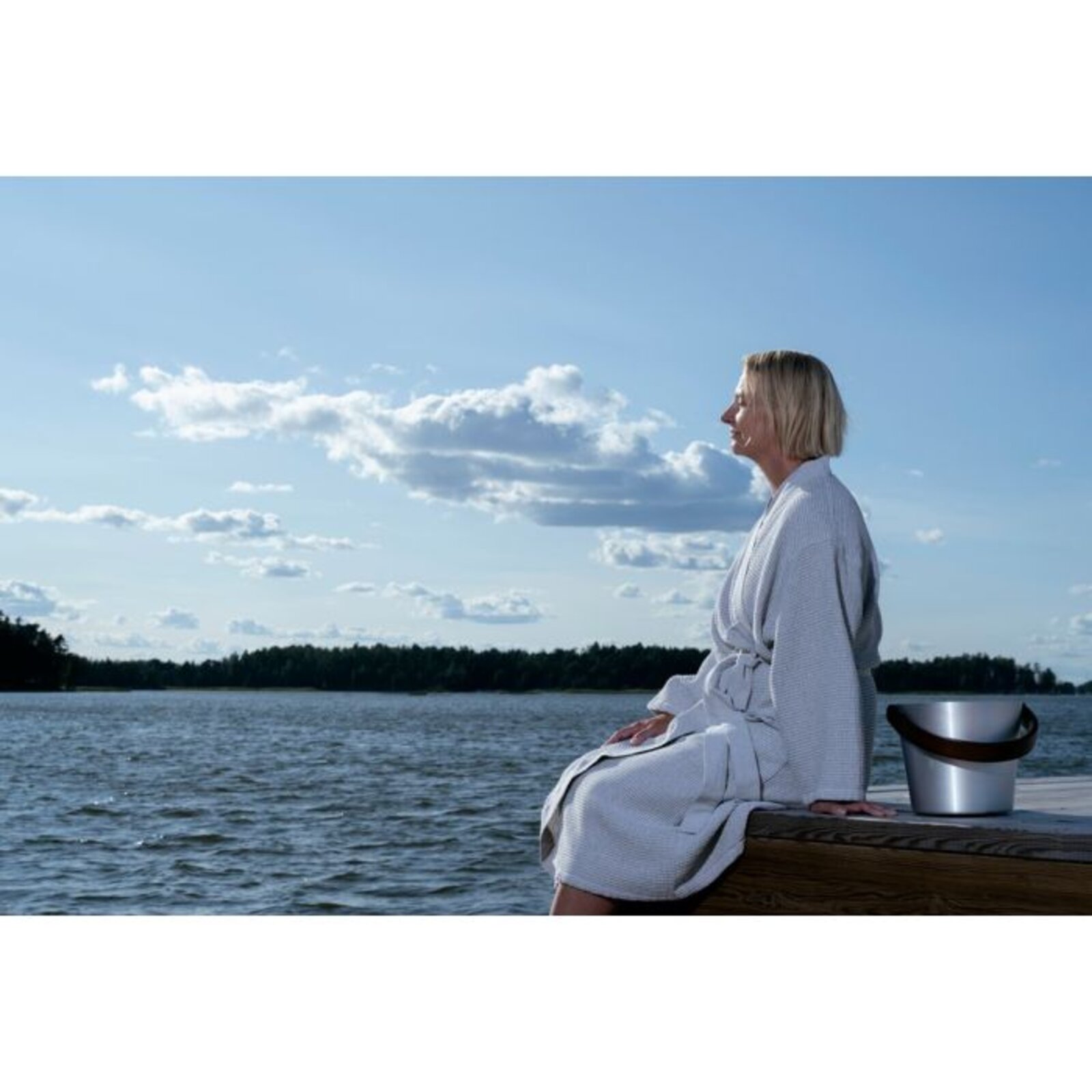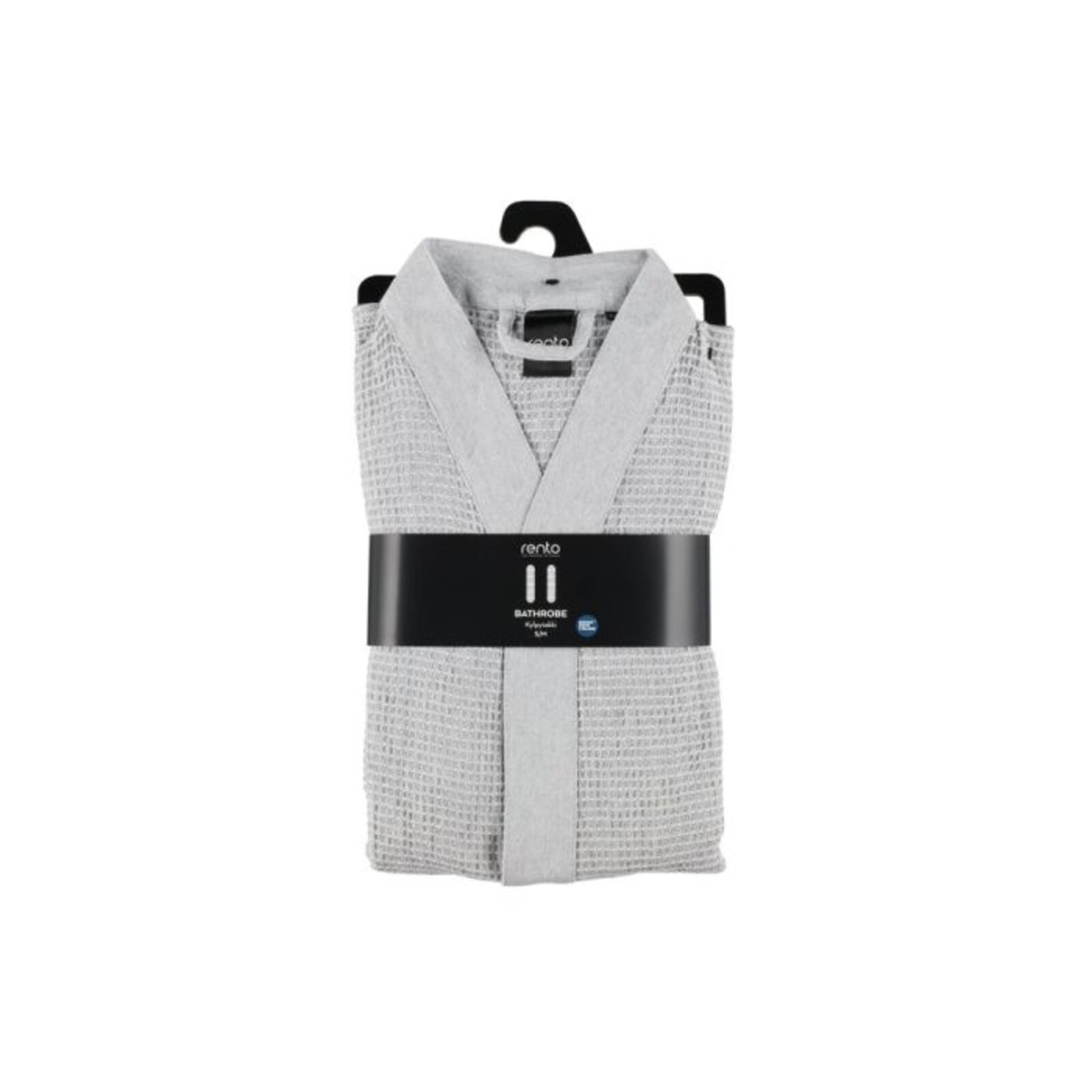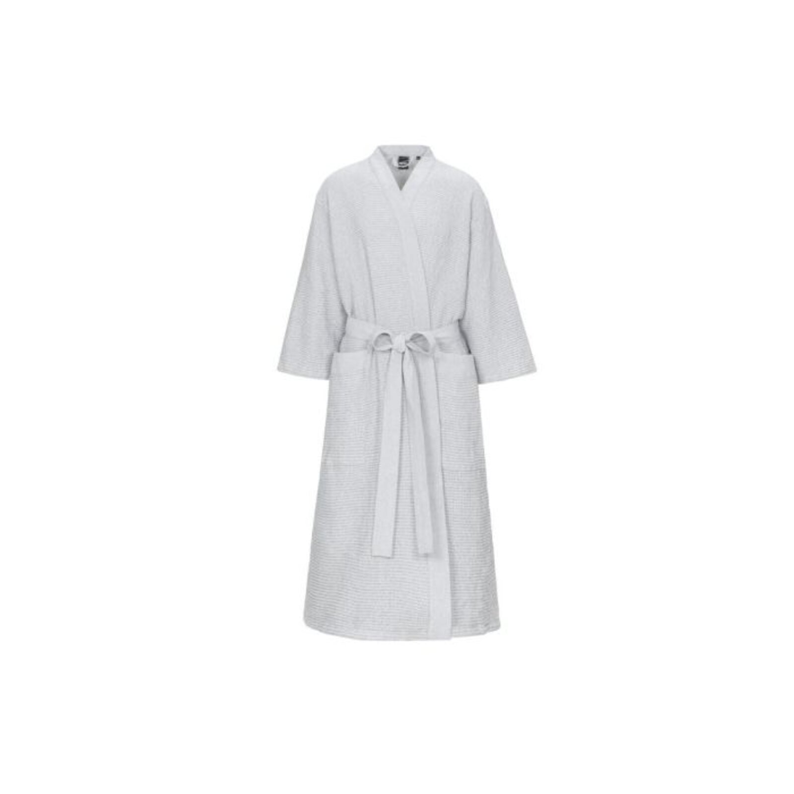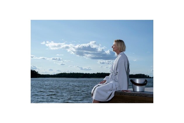 Saunový župan s chambray ramínky a páskem. Recyklovaná bavlněná textilie pro saunu se vyznačuje jemností a vokšinovou strukturou látky.
