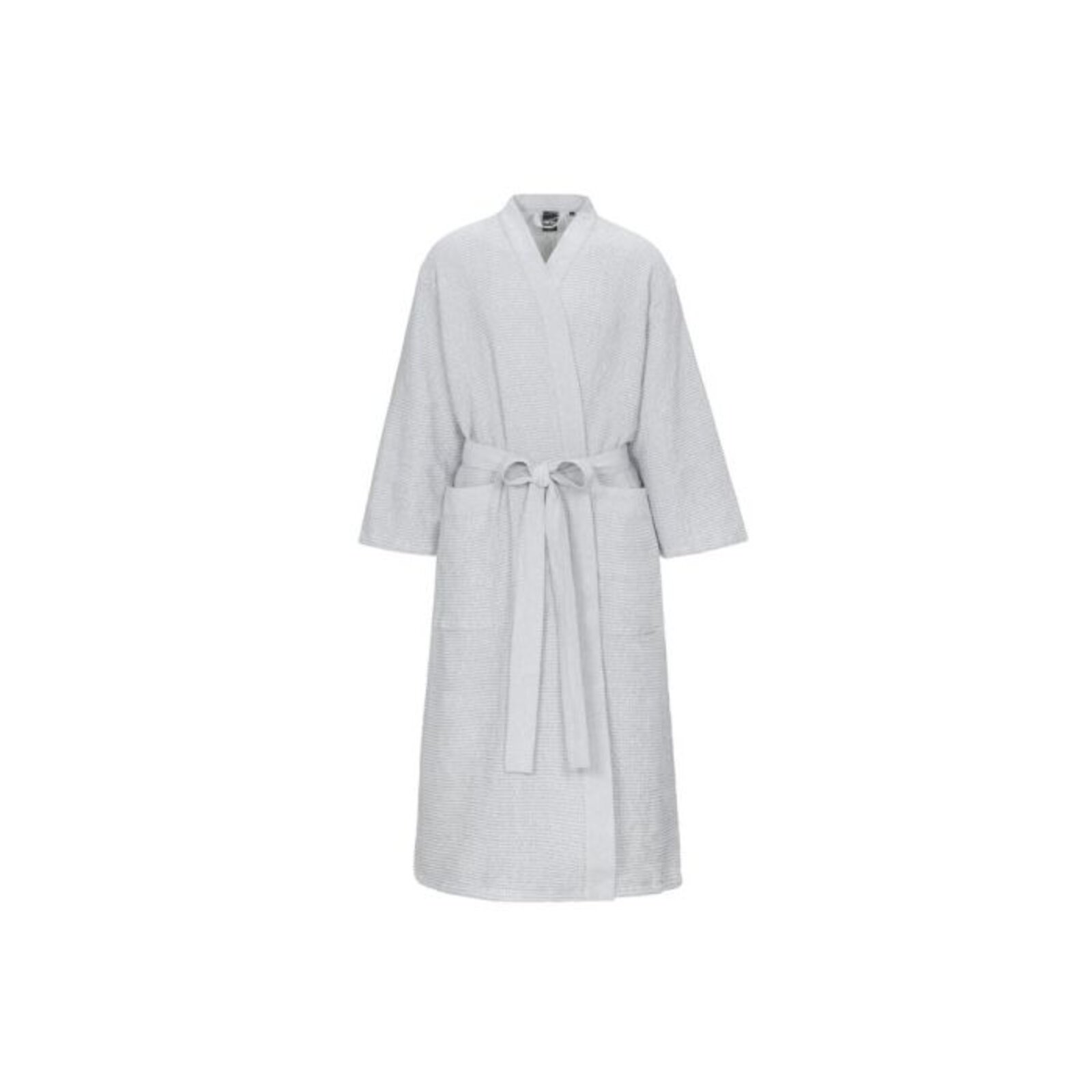 Saunový župan s chambray ramínky a páskem. Recyklovaná bavlněná textilie pro saunu se vyznačuje jemností a vokšinovou strukturou látky.